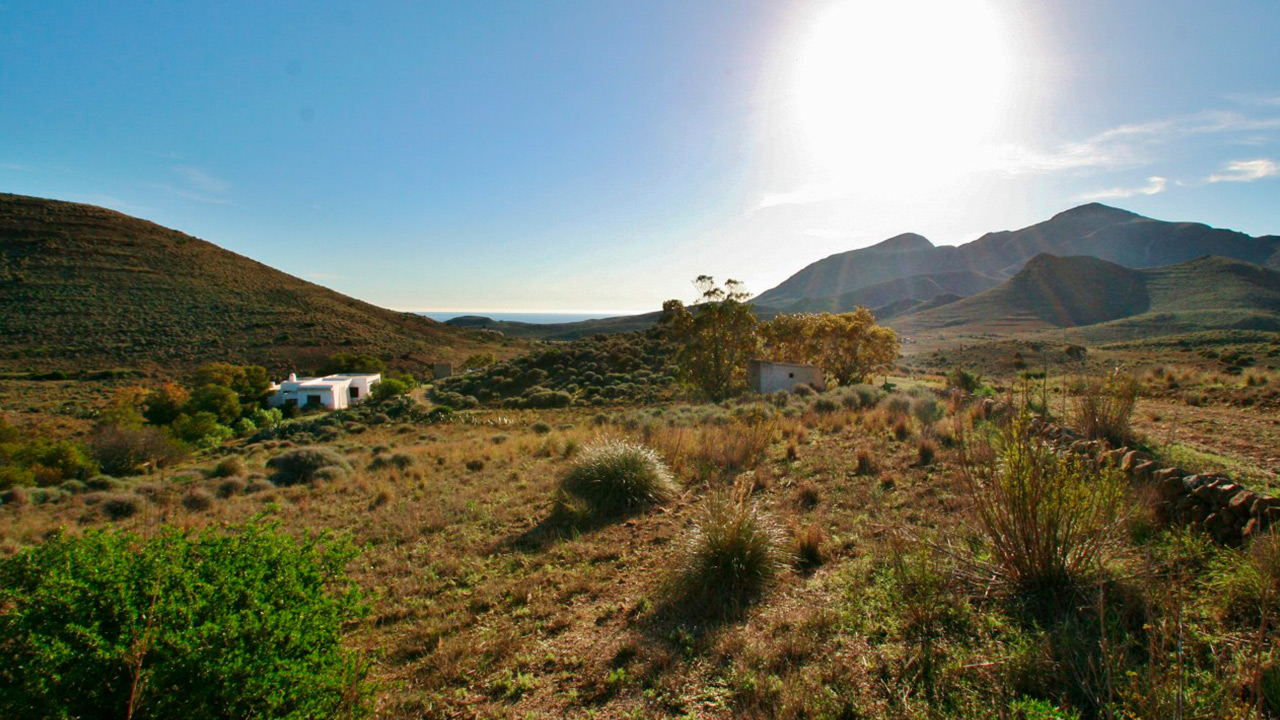 Entorno: Cortijo de 200m en el corazón del Parque Natural Cabo de Gata-Níjar, entre San José y Los Escullos y frente a los dos picos de "El Fraile", el volcán más alto del Cabo de Gata. Desde la casa puede verse el mar en Los Escullos (apróx.a 3 km) y cuenta con 6.300m de terreno protegido lleno de pitas, chumbares, palmitos y diferentes especies de árboles. La arquitectura con arcos, diferentes alturas y techos altos es la típica de la zona, aunque el estilo de suelos y azulejos es la propia del año de construcción.