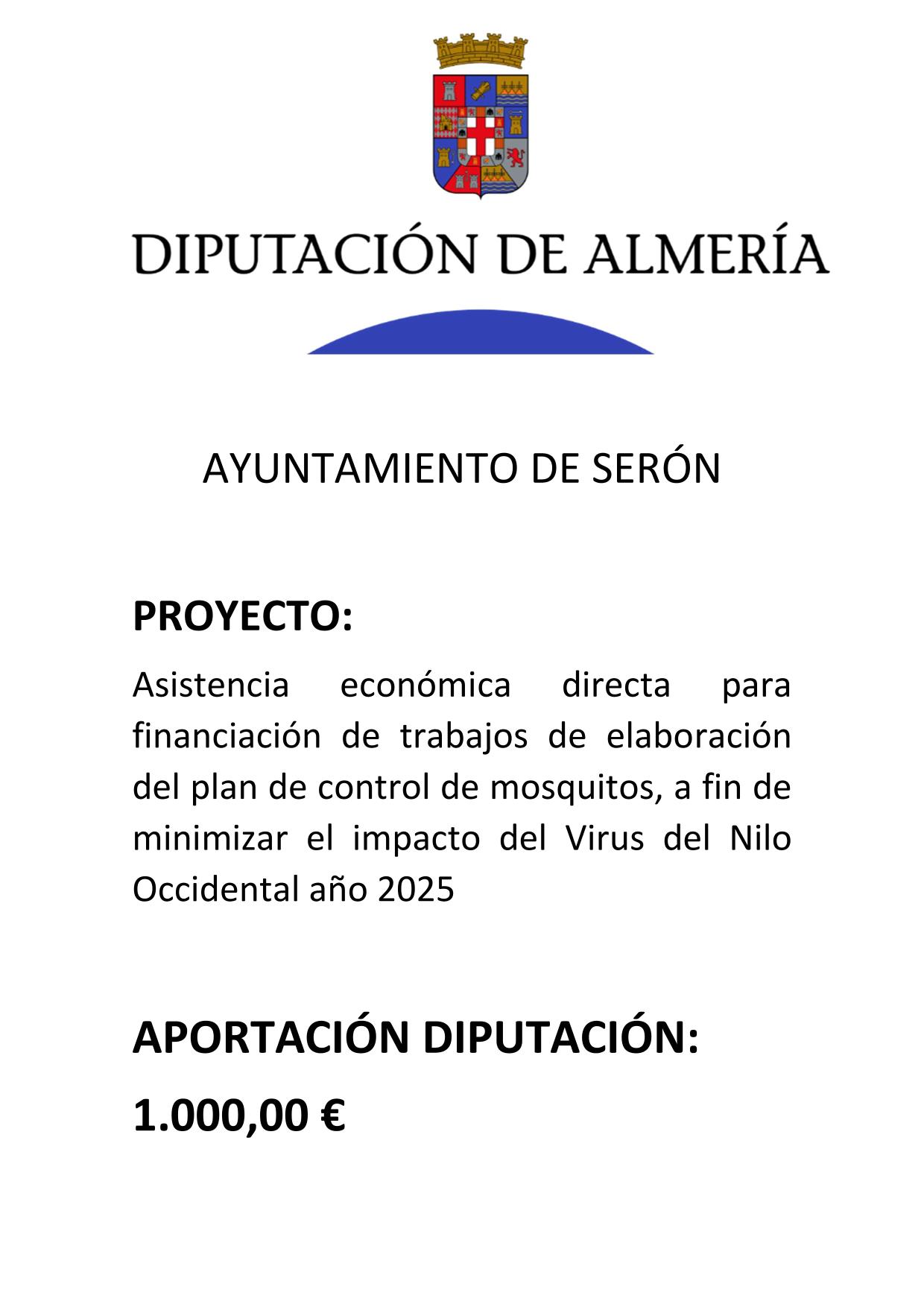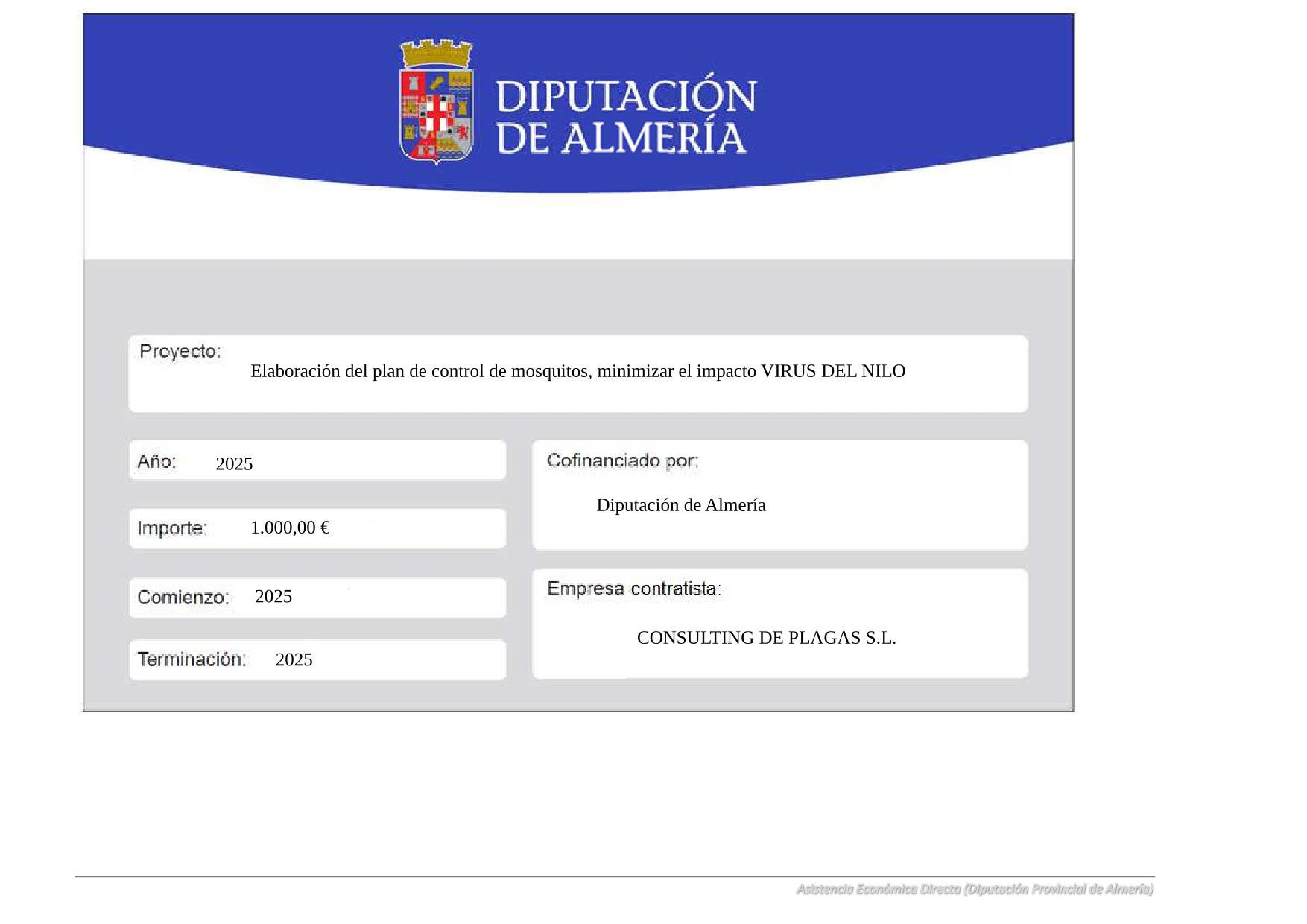 Asistencia económica directa para financiación de trabajos de elaboración del plan de control de mosquitos, a fin de minimizar el impacto del Virus del Nilo Occidental año 2025 Diputación Provincial de Almería
